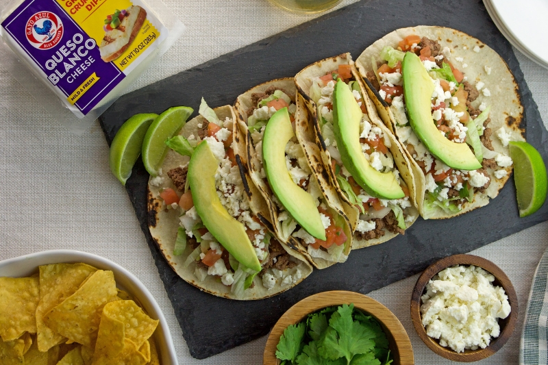 Una vez que la carne esté completamente cocida, cubra las tortillas calientes con carne cocida, pico de gallo, jalapeño cortados en cubitos y queso Cotija Gayo Azul® desmenuzado. Adorne con cilantro picado y jugo de limón recién exprimido a gusto.